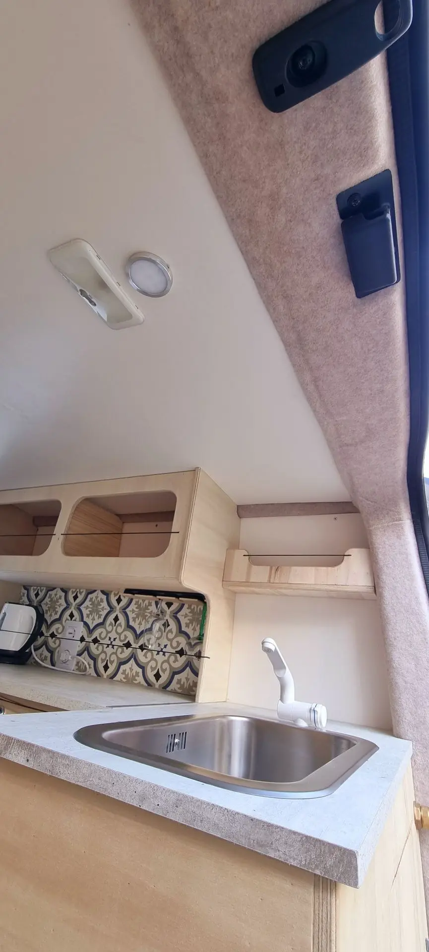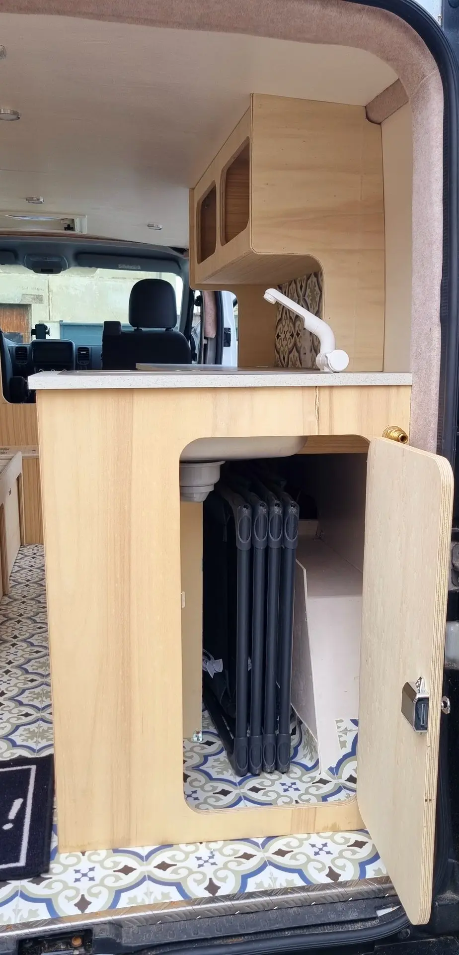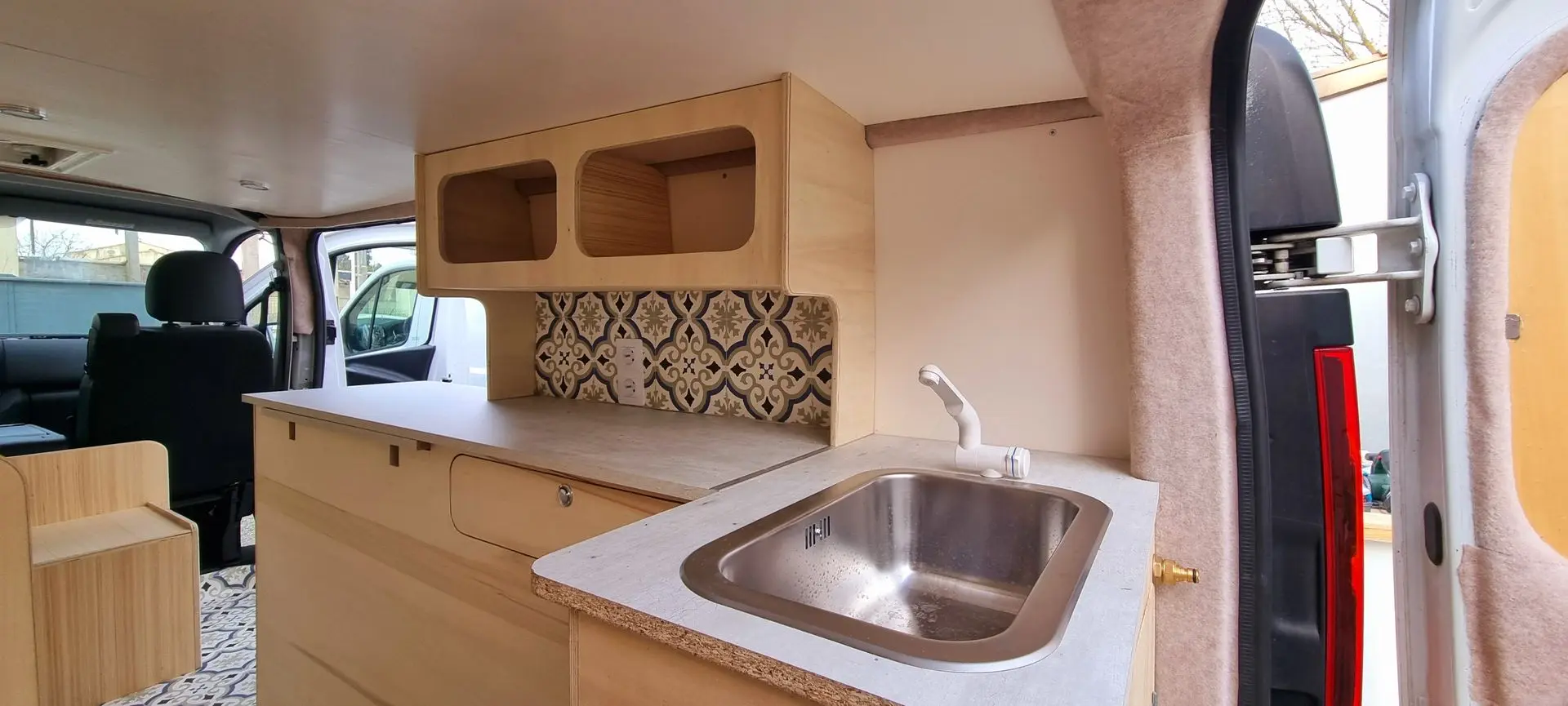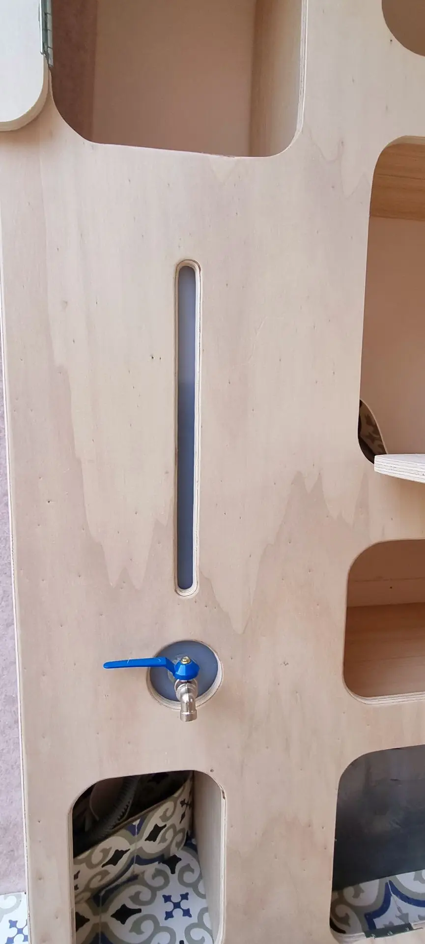 Réservoir d'eau propre de 30L à l'intérieur du van avec indicateur de niveau visible et robinet.