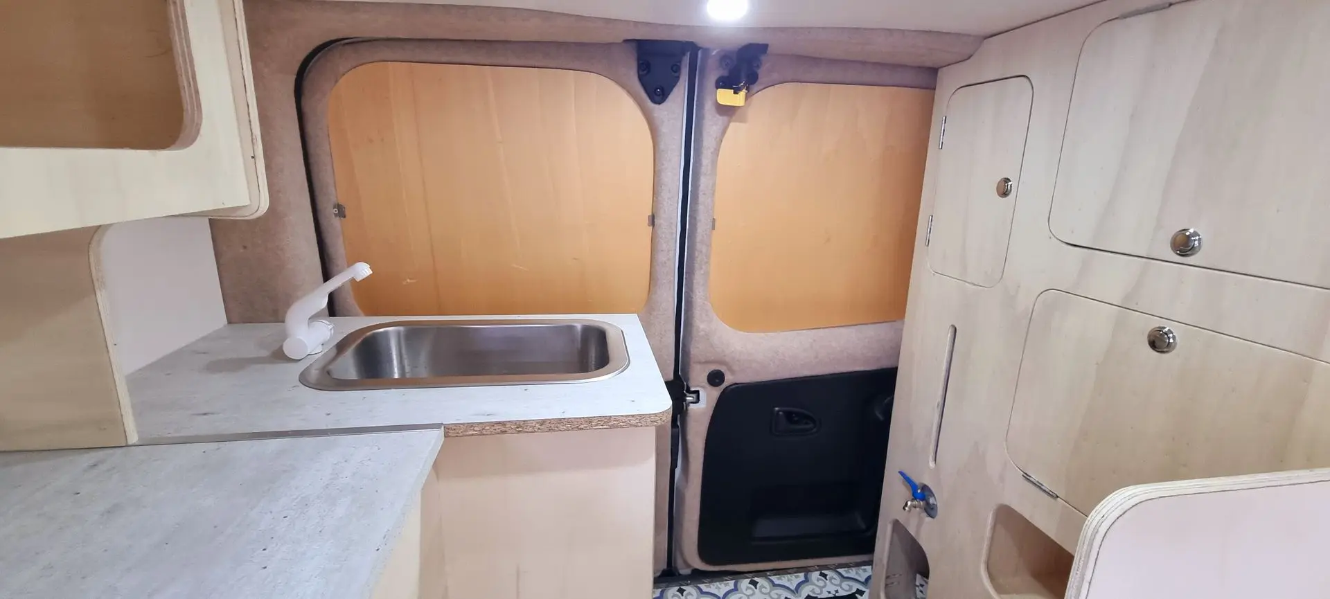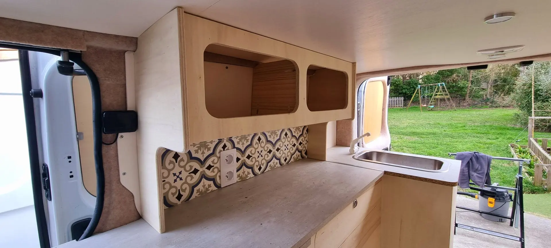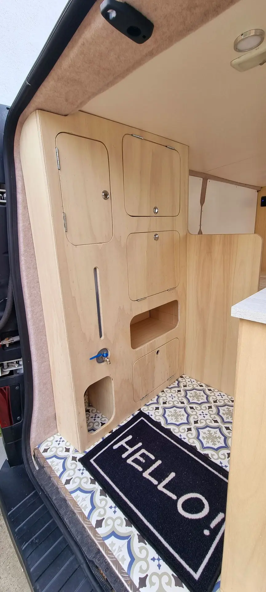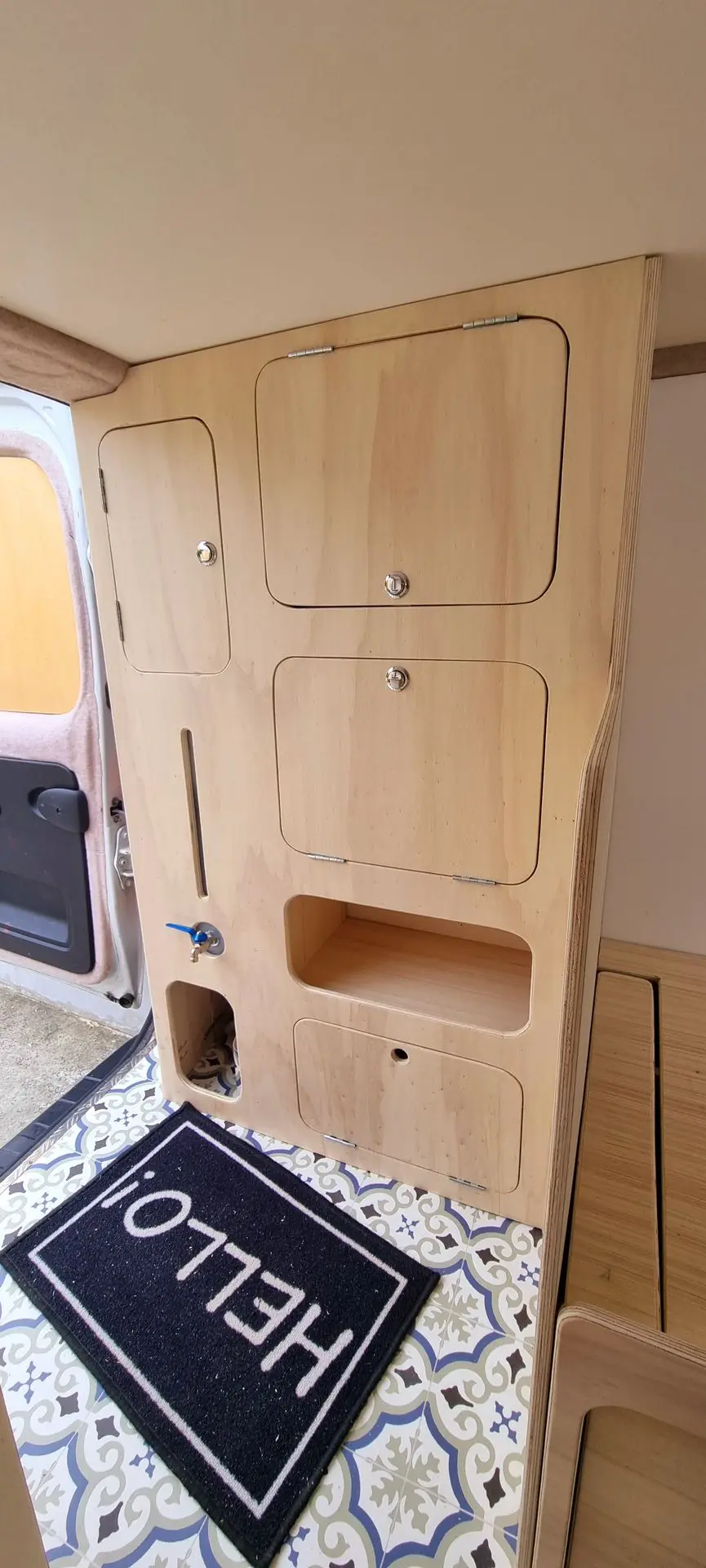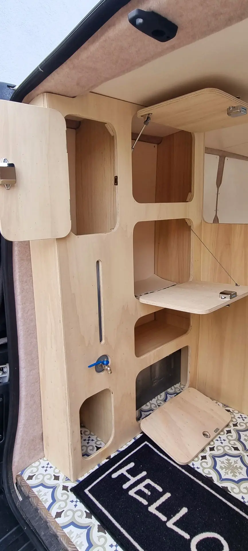 Réservoir d'eau propre de 30L à l'intérieur du van avec indicateur de niveau visible et robinet.