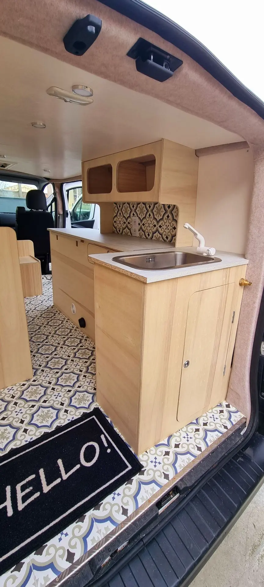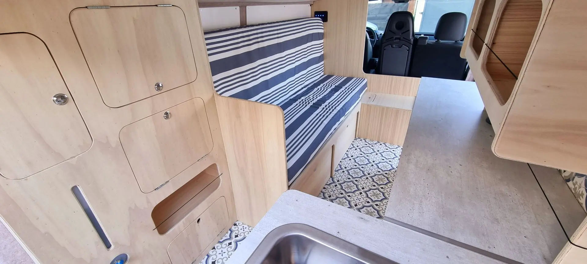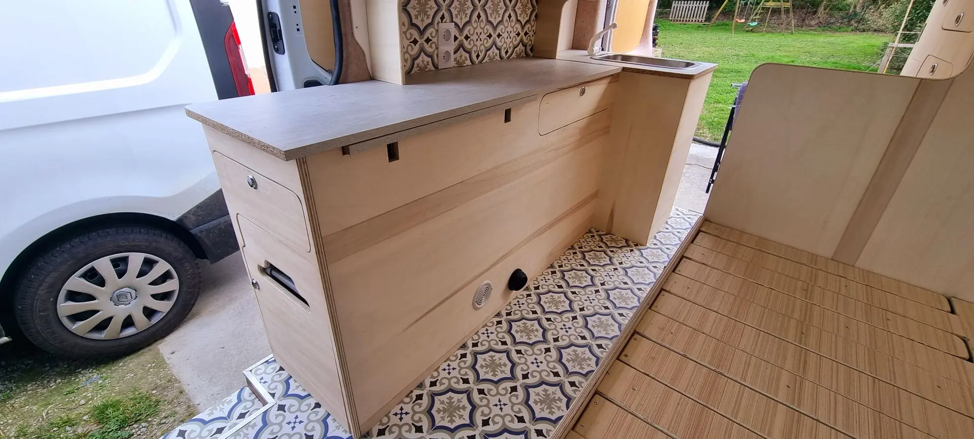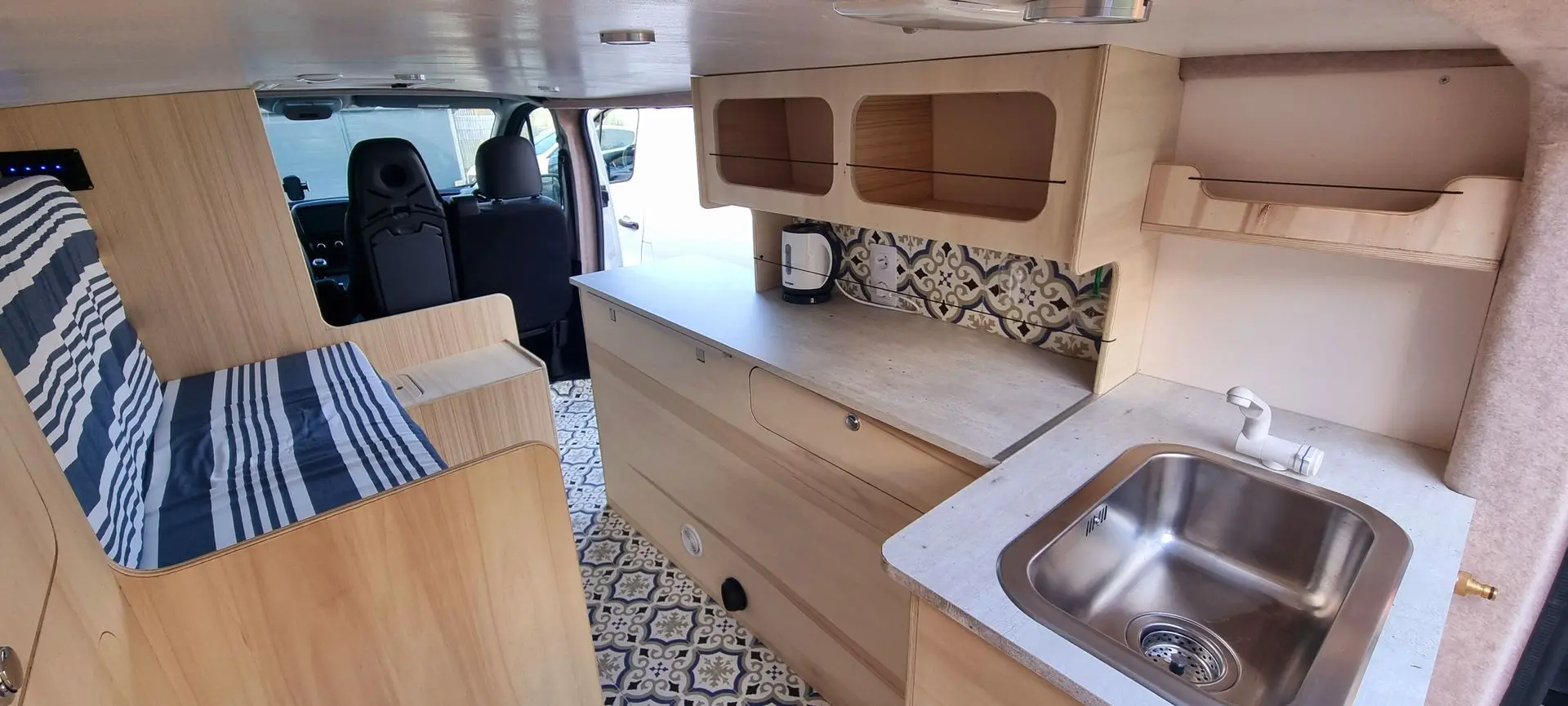 Réservoir d'eau propre de 30L à l'intérieur du van avec indicateur de niveau visible et robinet.