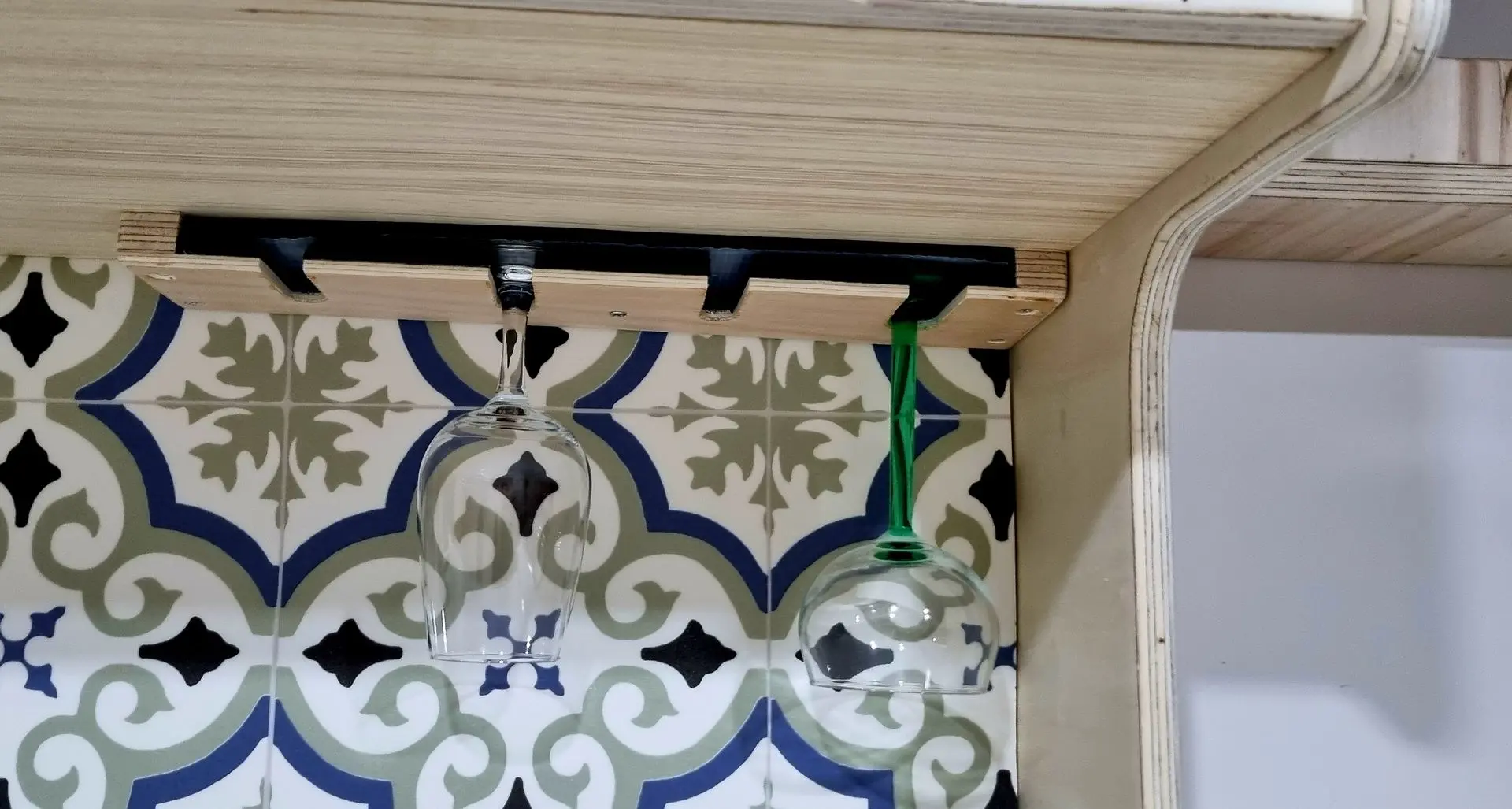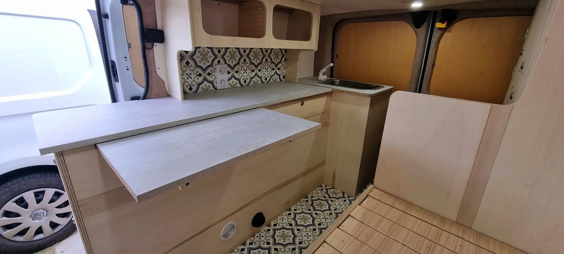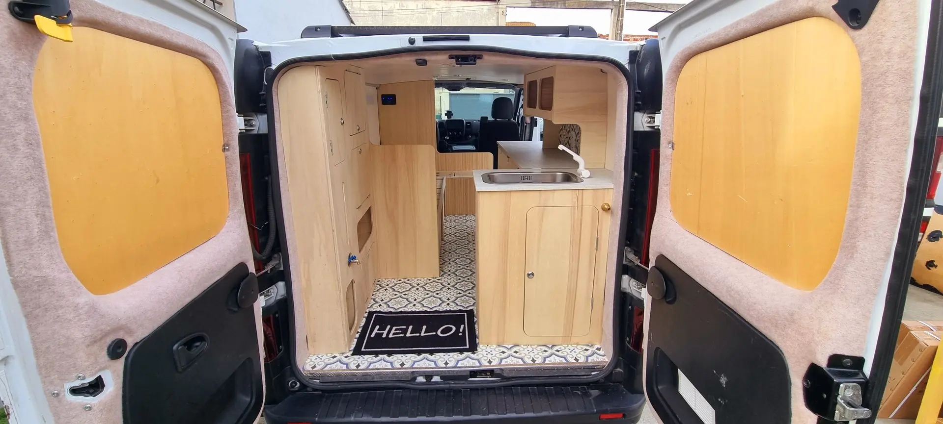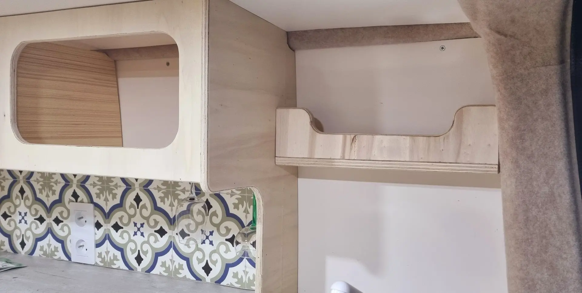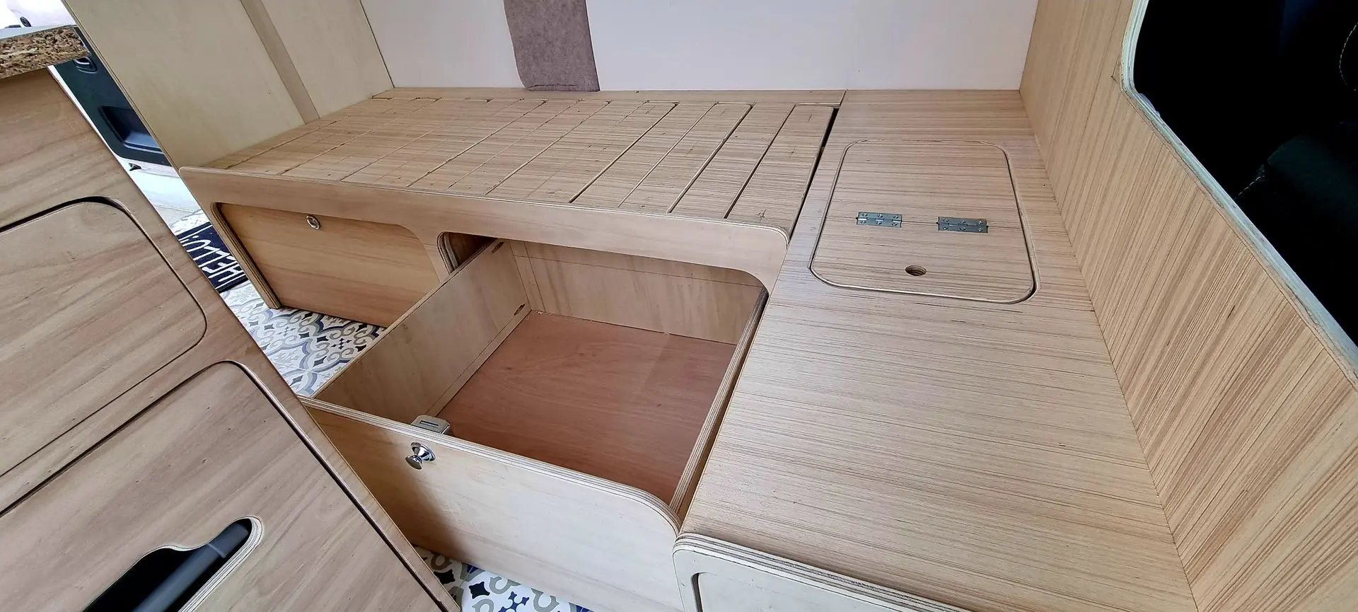 Réservoir d'eau propre de 30L à l'intérieur du van avec indicateur de niveau visible et robinet.